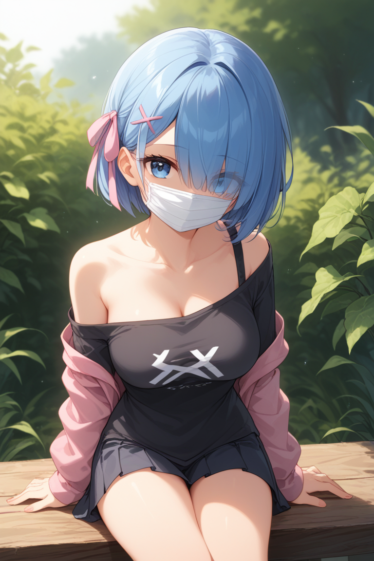 - 1girl, solo, 蓝发, 蓝眼, 短发, 发带, 头饰, x 头饰, 发辫, 一缕头发遮住眼睛, 刘海, 粉色发带, 头发间可见眼睛