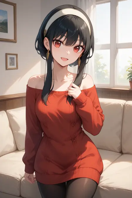 - pantyhose, sweater, jewelry, black pantyhose, red sweater, earrings, sweater dress, off shoulder, off-shoulder sweater, dress, gold earrings, bare shoulders