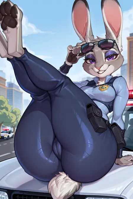 masterpiece, best quality, amazing quality, very aesthetic, high resolution, ultra-detailed, absurdres, newest, scenery, depth of field, scenery, volumetric lighting, by soviicoon, furry, furry female, anthro, zootopia, judy hopps, solo, half-closed eyes, eyewear on head, police uniform, tight clothes, animal ears, sunglasses, policewoman, rabbit ears, belt pouch, utility belt, ass, police car, ground vehicle, motor vehicle, looking at viewer, long sleeves, pants, white fur, body fur, blue pants, shirt, rabbit girl, blue shirt, hand up, eyeshadow, cameltoe, teeth, sitting, makeup, animal nose, adjusting eyewear, pocket, arm up, purple eyes, legs up, belt, smile, parted lips, on vehicle, hand on eyewear, :3, on back, thick thighs, medium breasts, blue eyeshadow, lying, leaning back, purple eyeshadow, feet out of frame