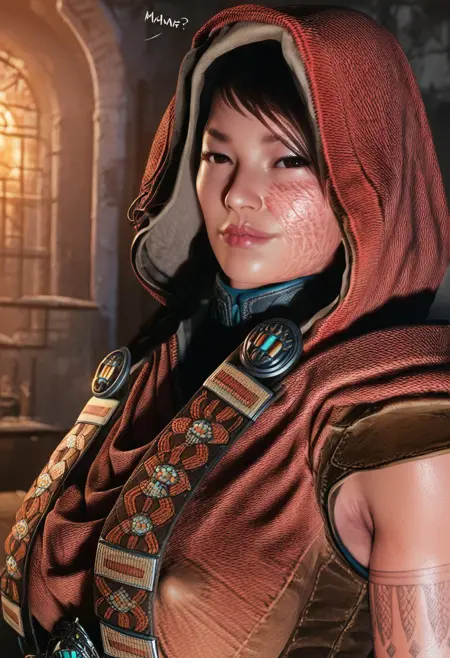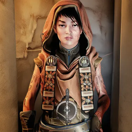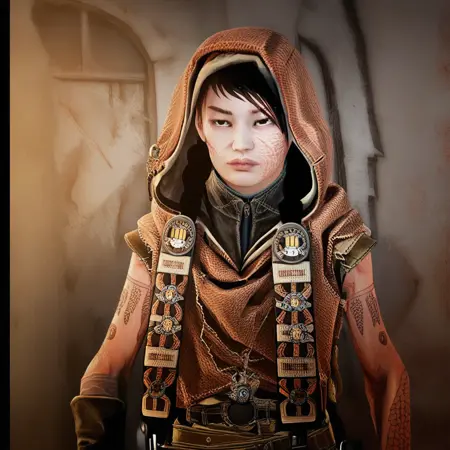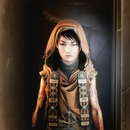 GiulMetro, 1소녀, 혼자, 검은 머리, 갈색 눈, 후드, 장갑, 입술, 문신, 벨트, 보석, 두 개의 땋은 머리, 옷 장식, 무기, 저격소총, 손가락 없는 장갑, 부츠, 바지, 헤드램프, 흉터, 화상, 긁힌 흔적, 얼굴의 화상, 조끼, 짧은 소매,