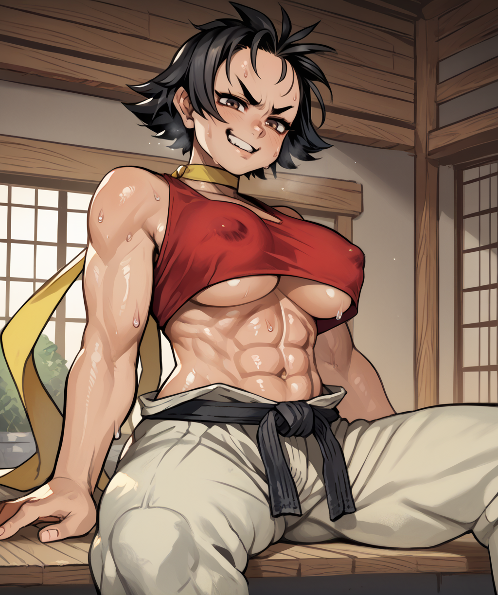 黄色のリボンチョーカー、またはリボンチョーカー、黒いベルト、または武道ベルト、白い道着(ドウギ)、またはジ、裸足