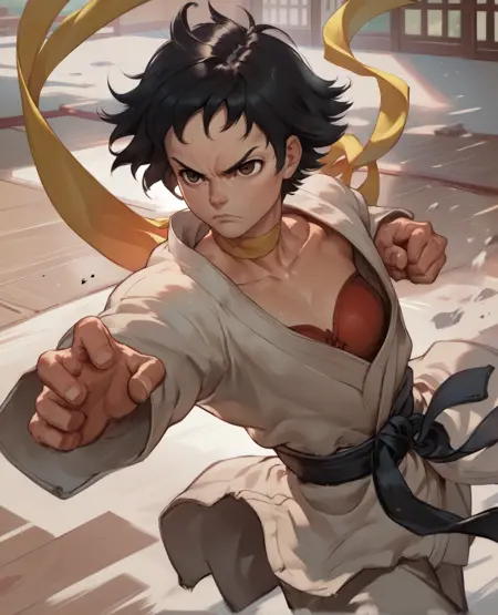 노란 리본 목걸이 또는 리본 목걸이, 검은 벨트 또는 무술용 벨트, 흰색 도기 또는 기, 발을 보지 않음,
