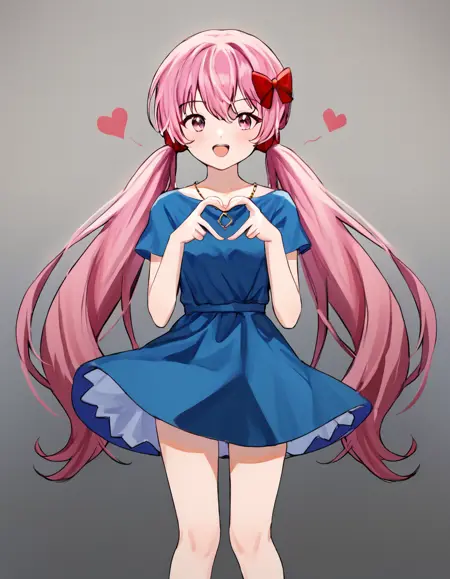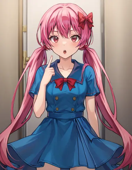 drug1rl, 1girl, solo, long hair, pink hair, twintails, red hair bow, blue dress