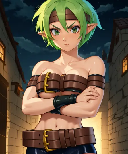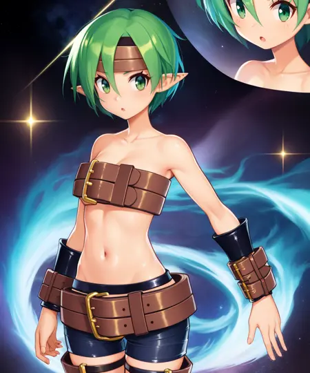 Valkyrie, pixie cut, or short hair, - green hair, green eyes, pointy ears, - brown headband,