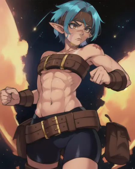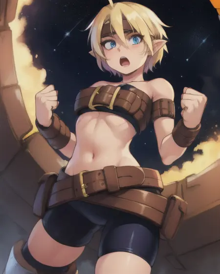 bare shoulders, armored thigh boots, or greaves, bike shorts ,midriff, beltbra, belt buckle, or brown belts, or belt, sleeveless,