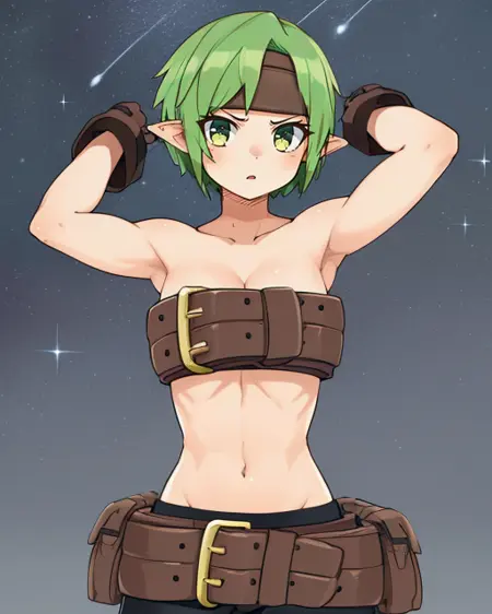 Valkyrie, pixie cut, or short hair, - green hair, green eyes, pointy ears, - brown headband,