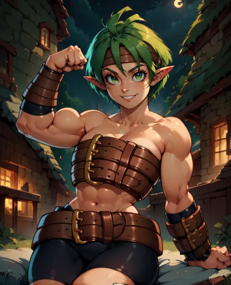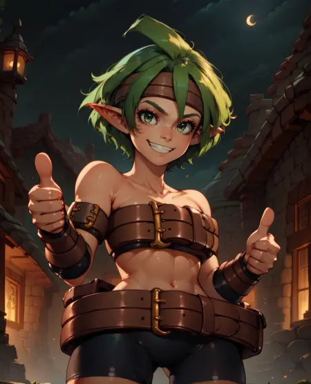 裸露肩膀,护甲长筒靴或护胫,骑行短裤,露脐装,腰带式内衣,腰带扣,棕色腰带或普通腰带,无袖,