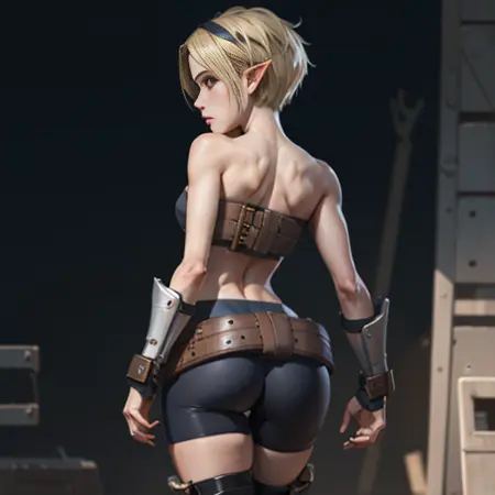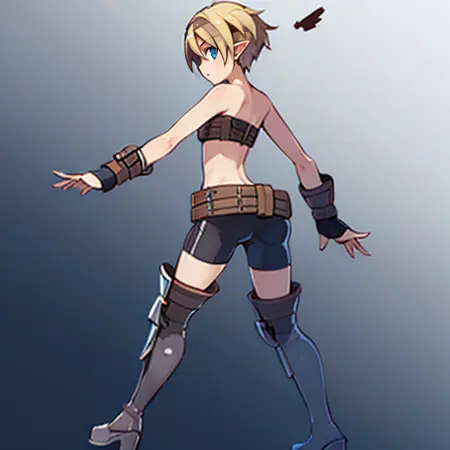 裸露肩膀,护甲长筒靴或护胫,骑行短裤,露脐装,腰带式内衣,腰带扣,棕色腰带或普通腰带,无袖,