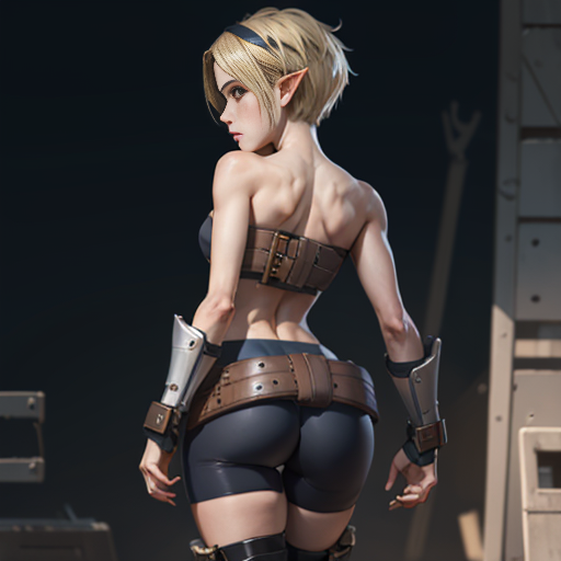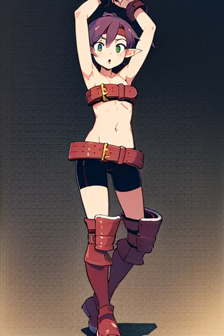 어깨 노출, 아머 힙부츠 또는 허벅지 보호장갑, 바이크 숏パン, 미디프리프, 벨트브라, 벨트 버클 또는 갈색 벨트, 벨트, 스lee브리스,