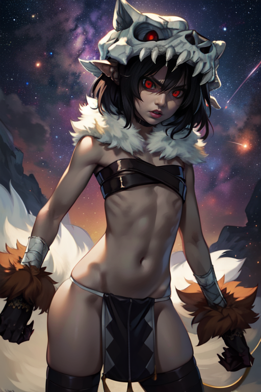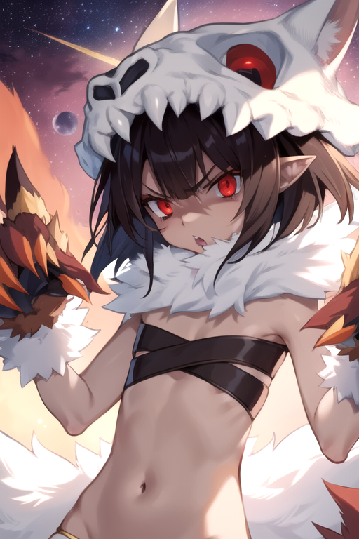 移除头盔——建议在负向提示中加入 helmet, bone helmet, animal ears, hat, animal skull, hair ornament ——可能需要加权处理