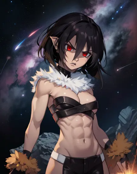 Shaman. red eyes, short brown hair, pointy ears, -- fangs, when mouth open,