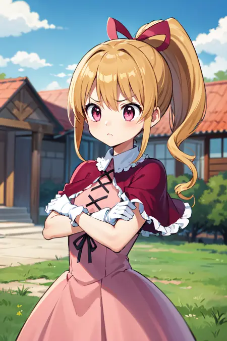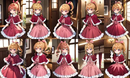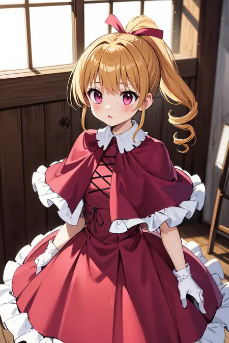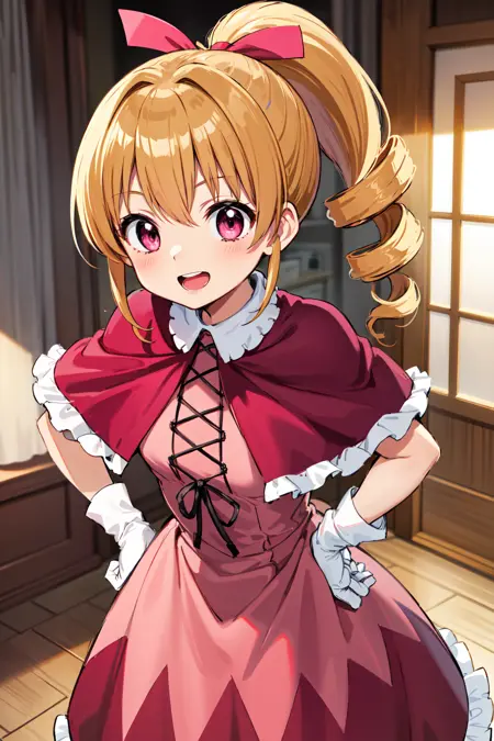 아우트핏1 (후드 헤어)hmbk1, 1girl, ponytail, drill hair, pink eyes, red capelet, ribbon, white gloves, pink dress, frills