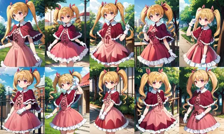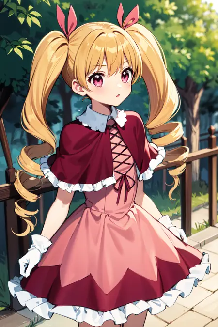 아우트핏1 (이중꼬리)hmbk1, 1girl, twintails, drill hair, long hair, pink eyes, red capelet, ribbon, white gloves, pink dress, frills