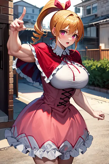outfit2hmbk1, 1girl, ponytail, drill hair, pink eyes, (muscular:1.1), muscular female, large breasts, pink dress, frills, red capelet, ribbon, white bloomers