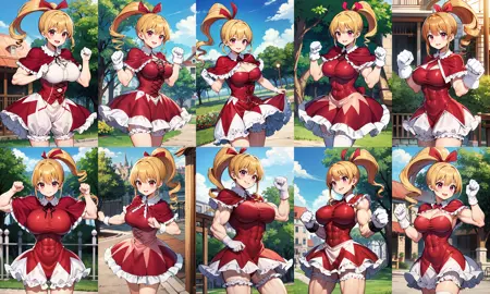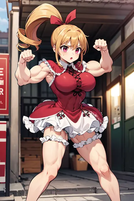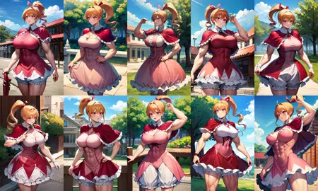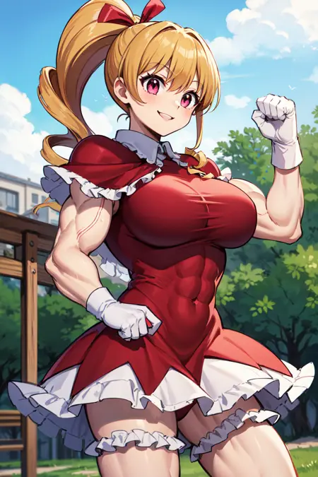 아우트핏2hmbk1, 1girl, ponytail, drill hair, pink eyes, (muscular:1.1), muscular female, large breasts, pink dress, frills, red capelet, ribbon, white bloomers