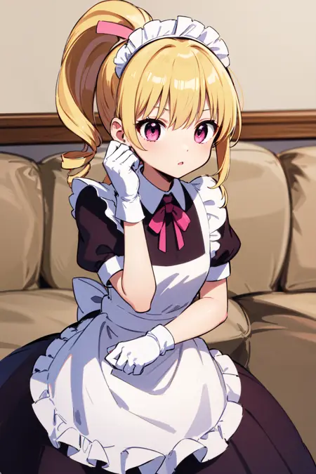 outfit1 (ponytail)hmbk1, 1girl, ponytail, drill hair, pink eyes, red capelet, ribbon, white gloves, pink dress, frills