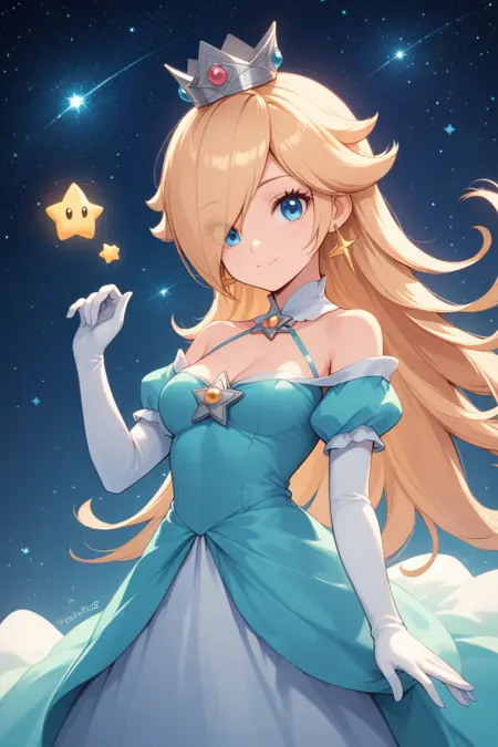 - dress, gloves, earrings, jewelry, blue dress, elbow gloves, star (symbol), bare shoulders, alternate costume