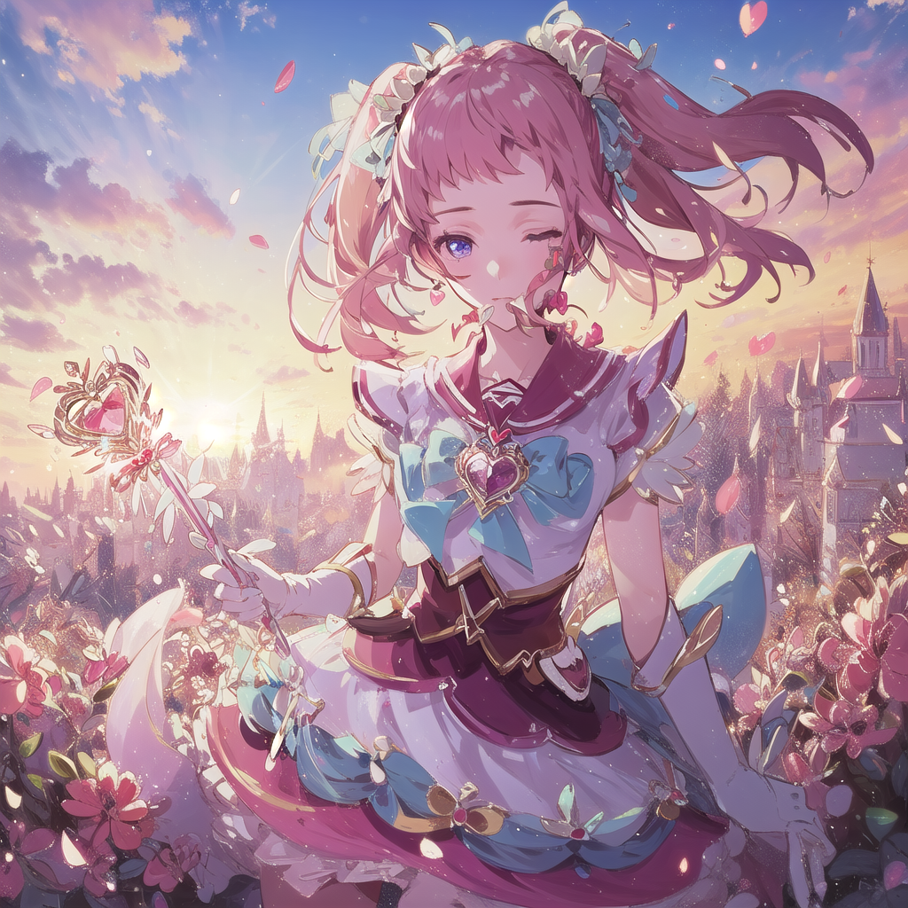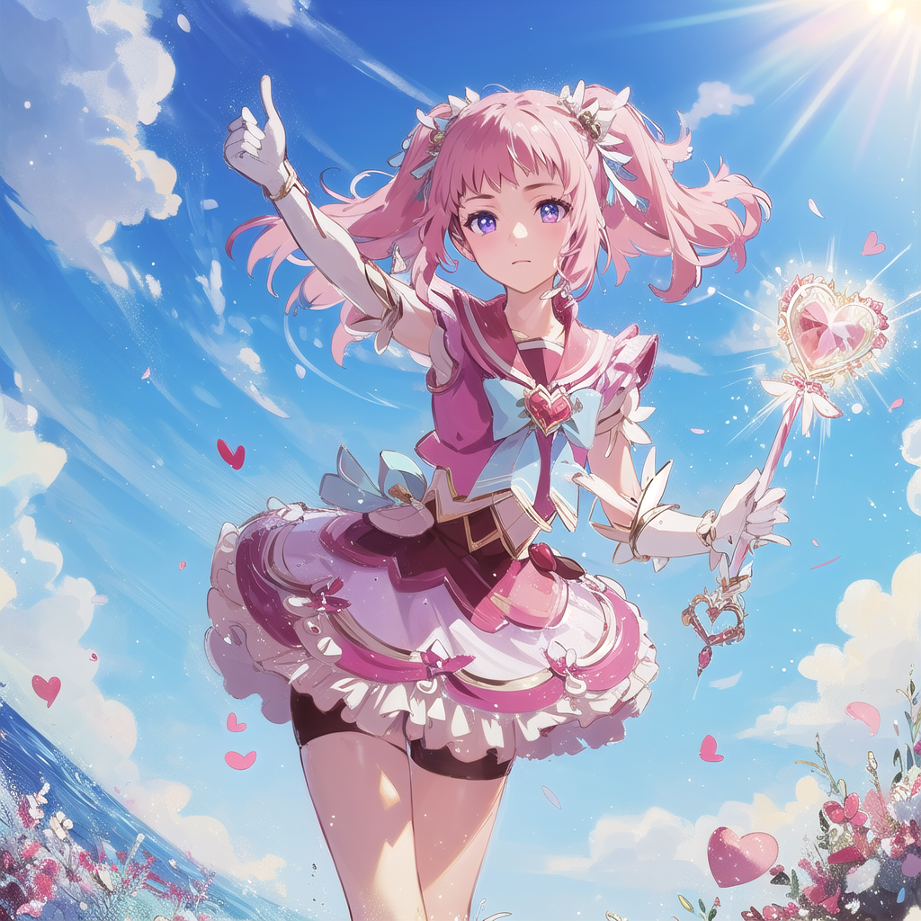 kirameki_mamika, pink_hair, purple_eyes, twintails, pink_dress, pink_shorts_under_skirt,  magical_girl, heart_wand, pink_shoes, blue_sailor_collar, blue_bow, white_elbow_gloves, pink_fanny_pack,