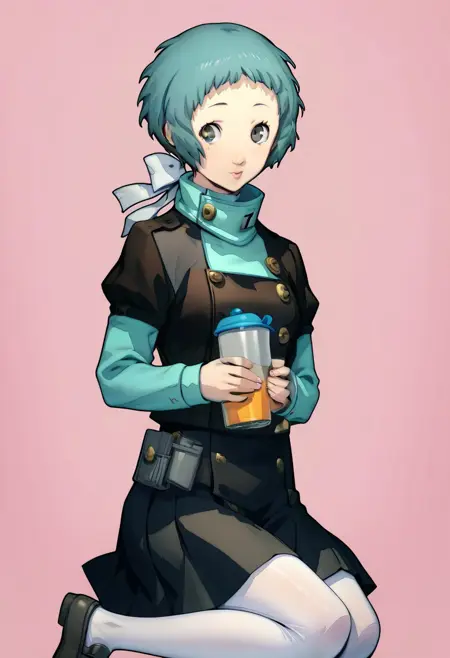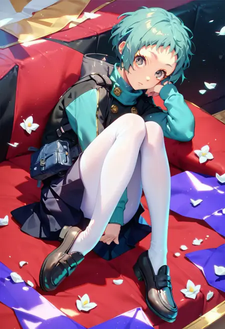 Yamagishi Fuuka, 1girl, solo, short hair, long sleeves, blue hair, fingerless gloves, capelet, grey eyes, aqua hair, grey eyes, headphones, skirt, white pantyhose, shoes, gekkoukan high school uniform