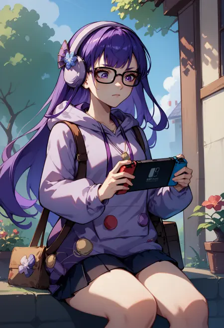 안경, 안경 쓴, 헤드폰, 머리 장식, 보라색 후디, 후드 내려진 상태, 끈, 긴 소매, 목걸이, 보석, 가방, 주름치마, 검은 치마, 현대적, 캐주얼