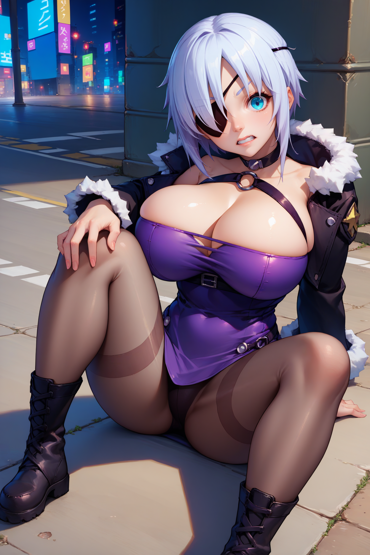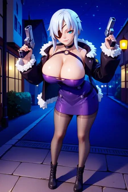 彼女の典型的な外見には、「アイパッチ、チョーカー、Oリング、紫のドレス、胸元、黒いジャケット、ファーのトリム、太ももバンド付きタイツ、黒いブーツ」を追加してください。