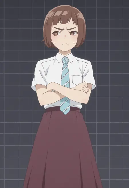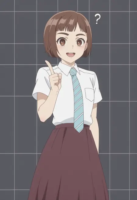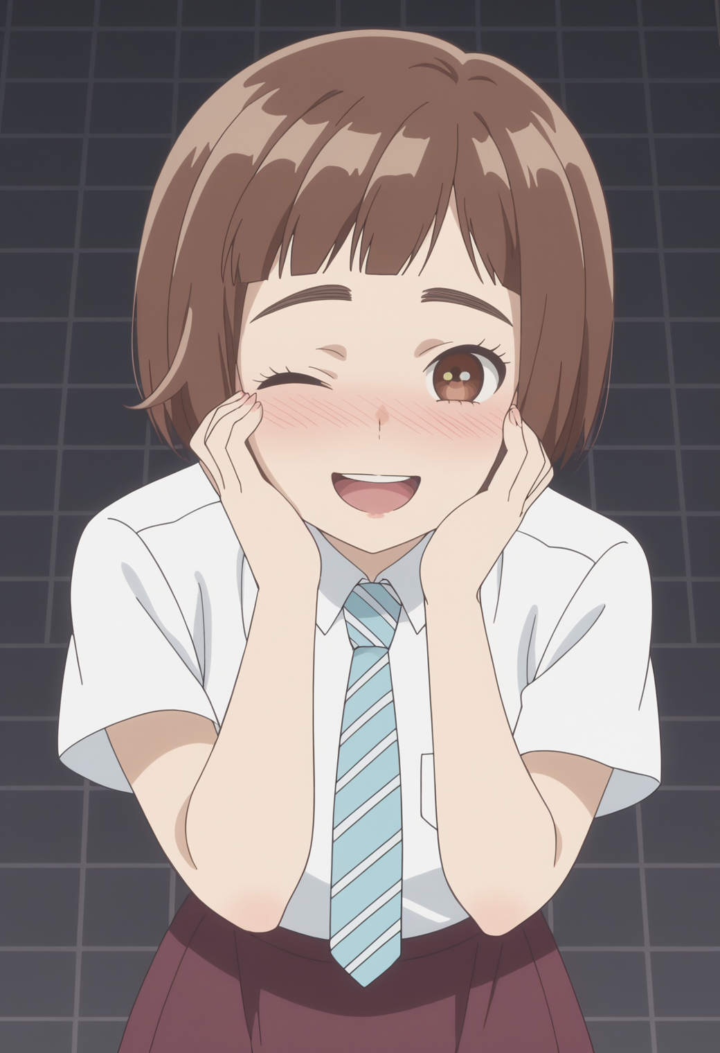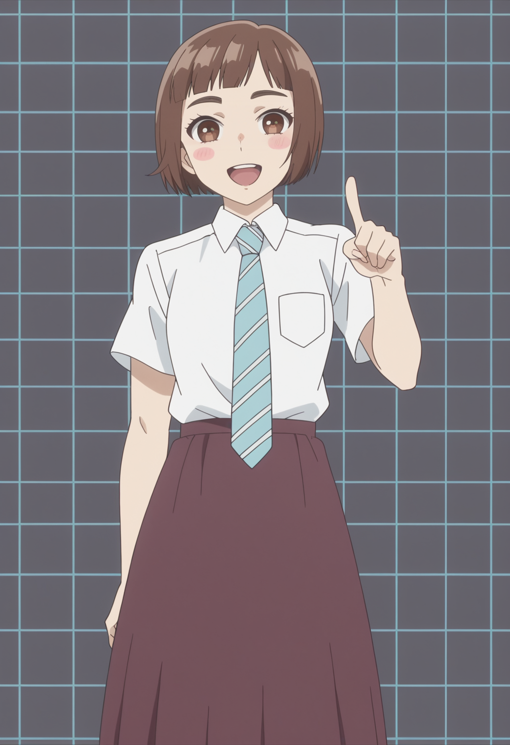 onodera kazusa, brown eyes, brown hair, thick eyebrows, bob cut, micro bangs