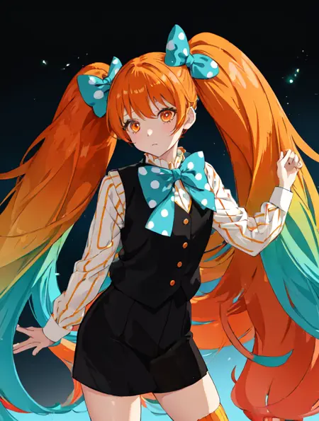 トリガー言葉: 1girl, titan, orange gradient hair, polka dot bow, very long hair, shirt, vest