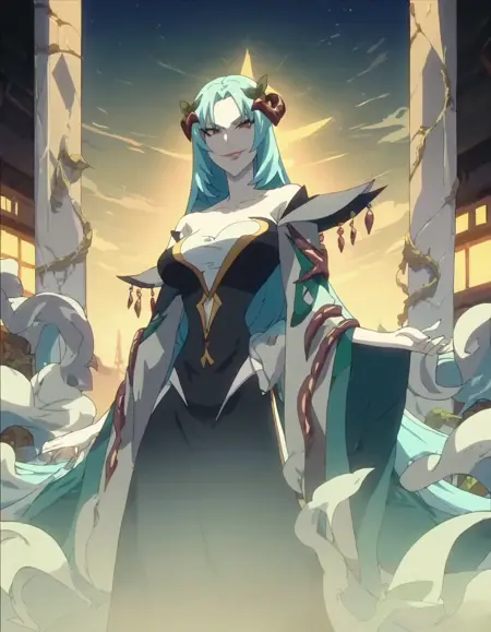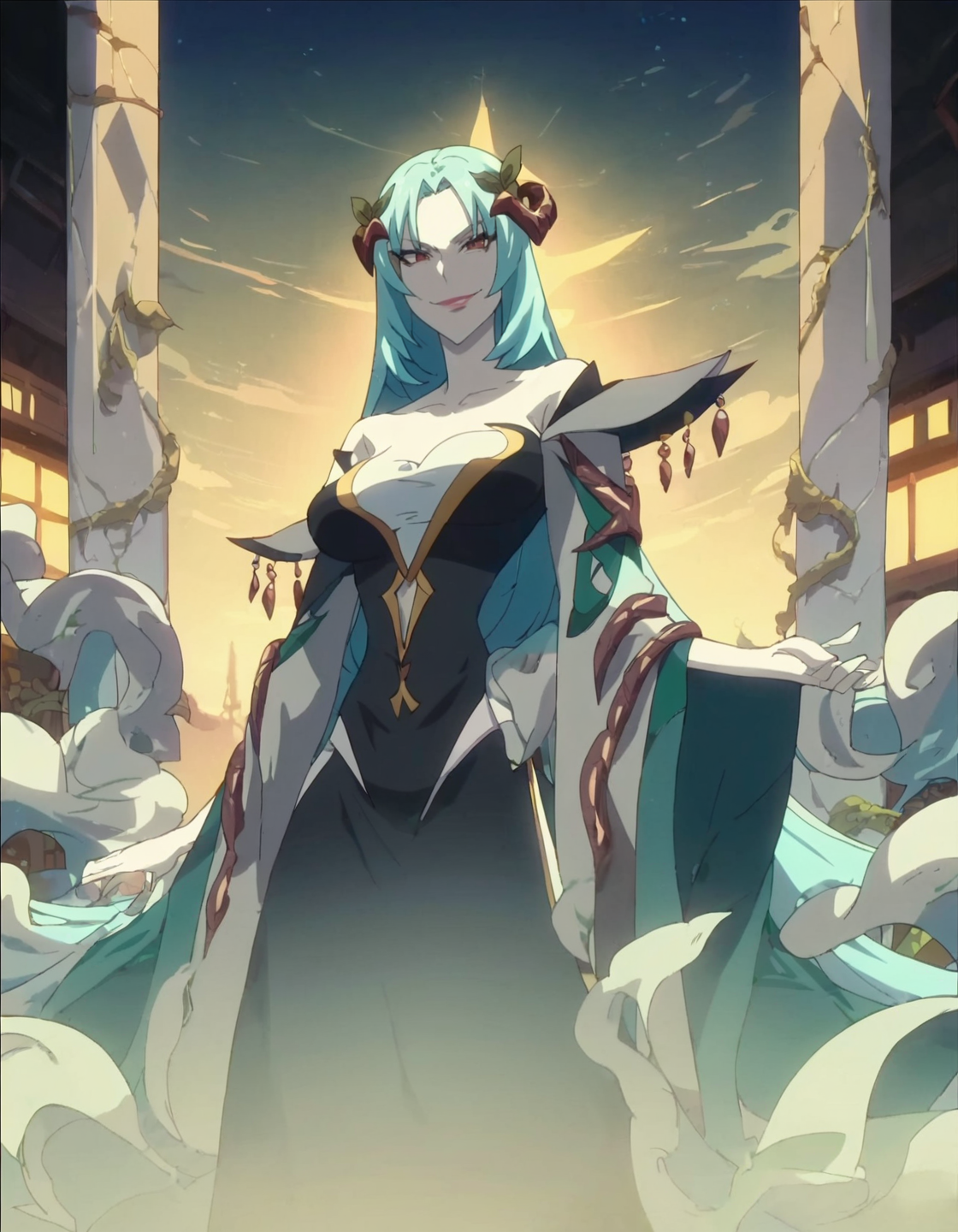 score_9, score_8_up, score_7_up, 1girl, solo, anime screencap, long hair, dress, blue hair, hair ornament, standing, large breasts, black dress, aqua hair, looking at viewer, evil smile, white skin, lora:northa:0.9