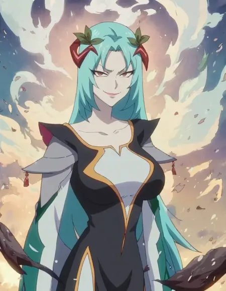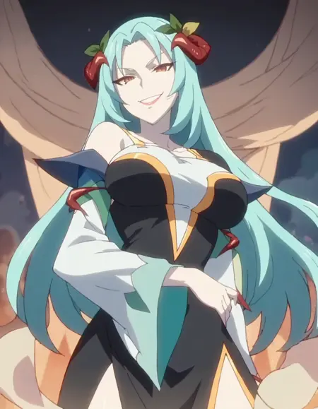 score_9, score_8_up, score_7_up, 1girl, solo, anime screencap, long hair, dress, blue hair, hair ornament, standing, large breasts, black dress, aqua hair, looking at viewer, evil smile, white skin, lora:northa:0.9