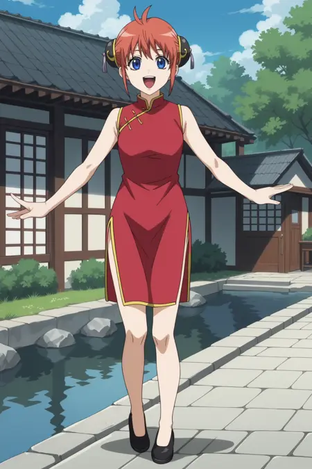 Kagura レッドチェンサム(黄色の縁取り)| 中国風衣装、ダブルバーン、バーンカバー、チャイナドレス