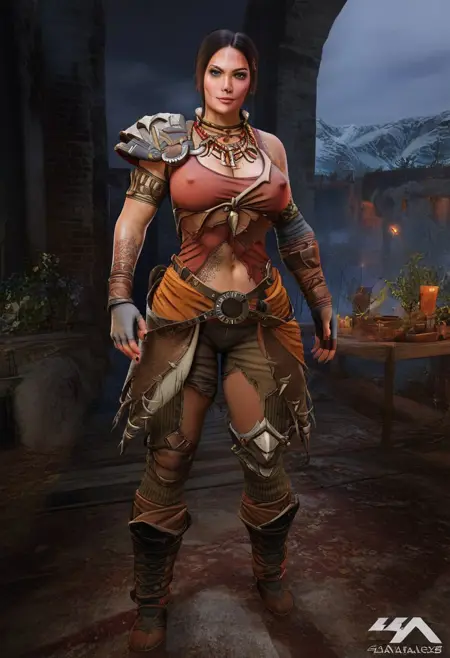OlgaMetro, 1人目の女の子, シングル, 黒髪, 緑の目, ポニーテール, 防具, ジュエリー, へそ, 大きな胸, 武器, 指なし手袋, ネックレス, ブーツ, 肩アーマー, タトゥー, 腹部, パウドラーン, 十字弩, パンツ, ベルト, 唇, 胸元, 片方のパウドラーン, 矢袋, 破れた服, 肩パッド, Tシャツ, ブレイス, レザー・ブレイス, レザー・アームレット