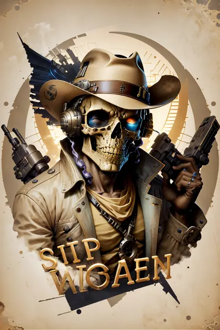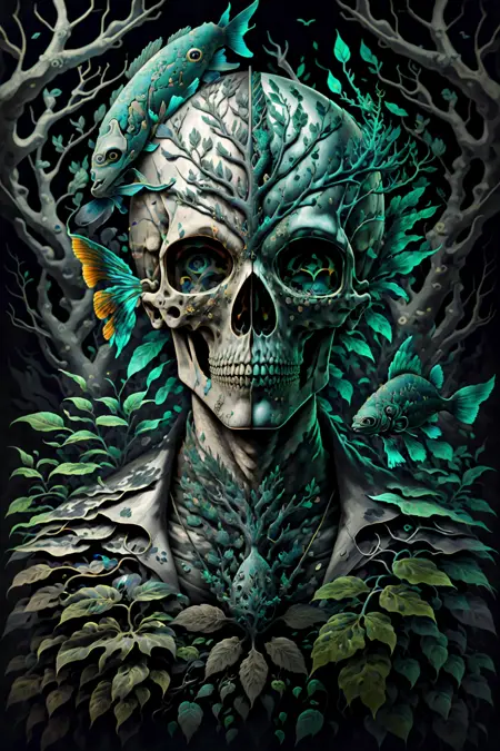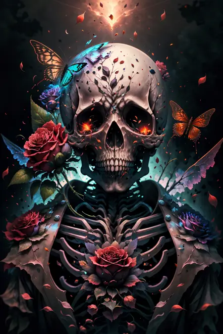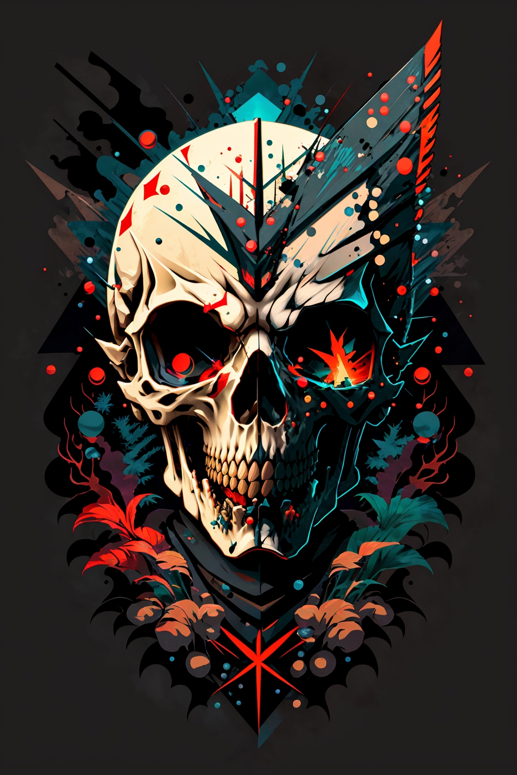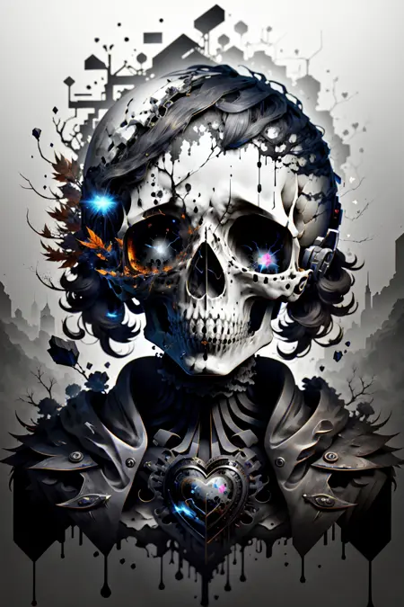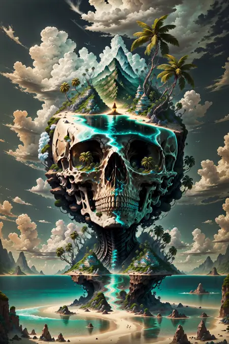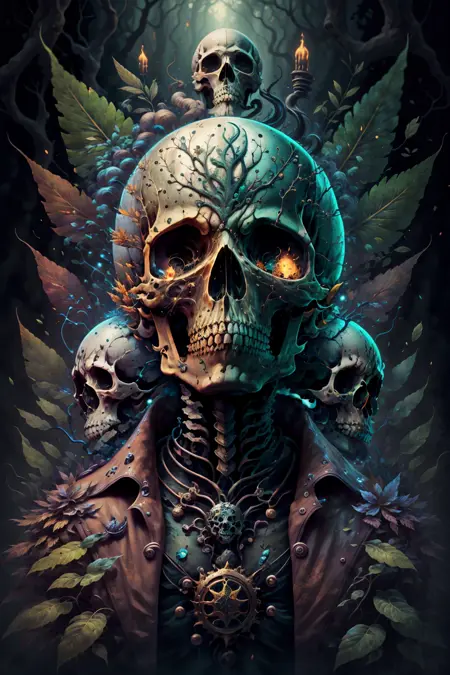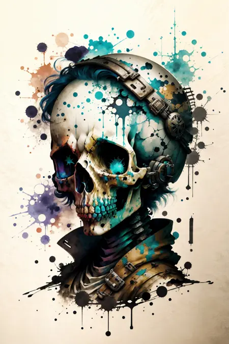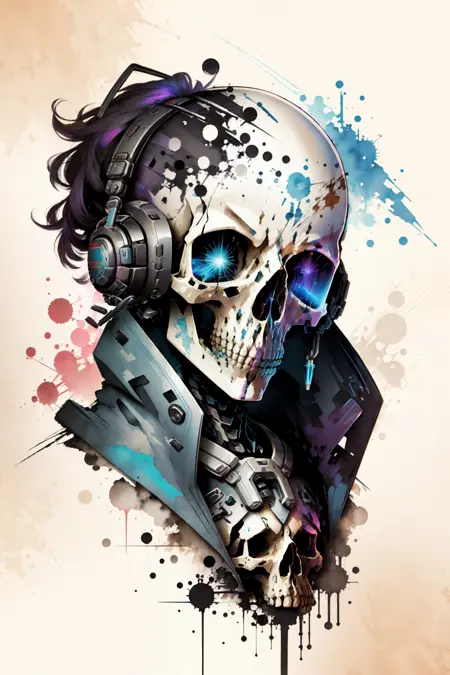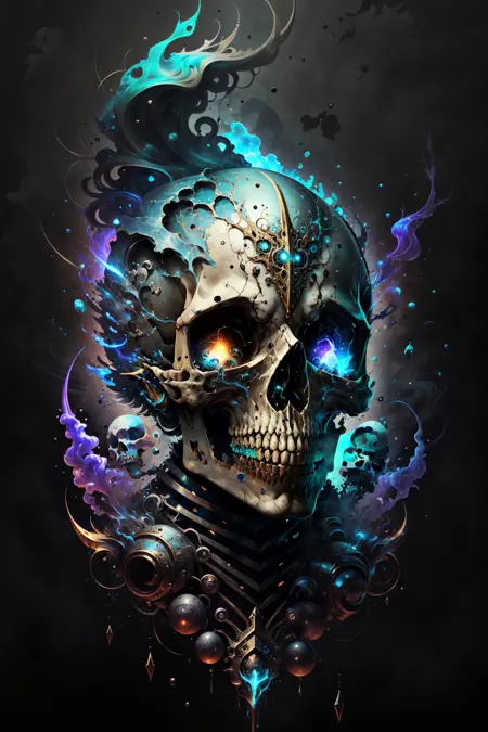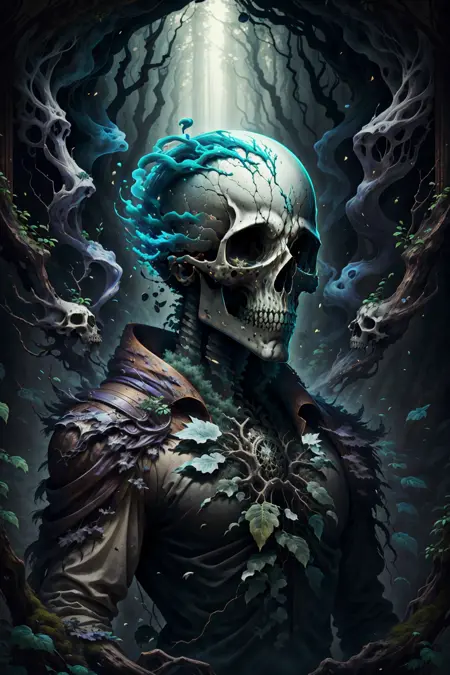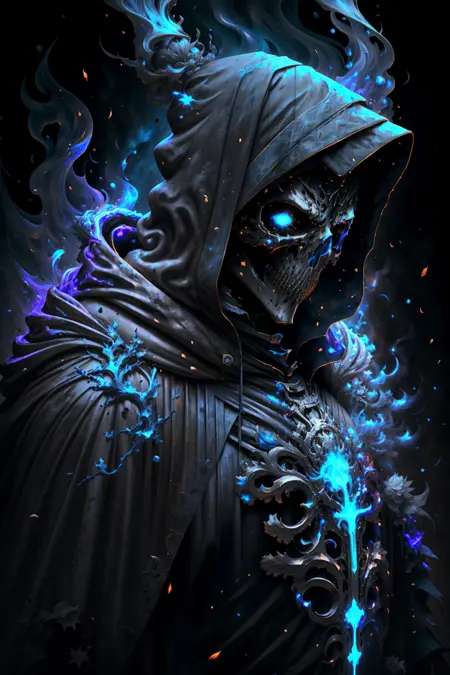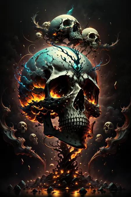 Prompt: solo, 1boy, standing, male focus, red hair, cloud, hood, from behind, cloak, skull, robe, painting lora:skulls00d-000012:1