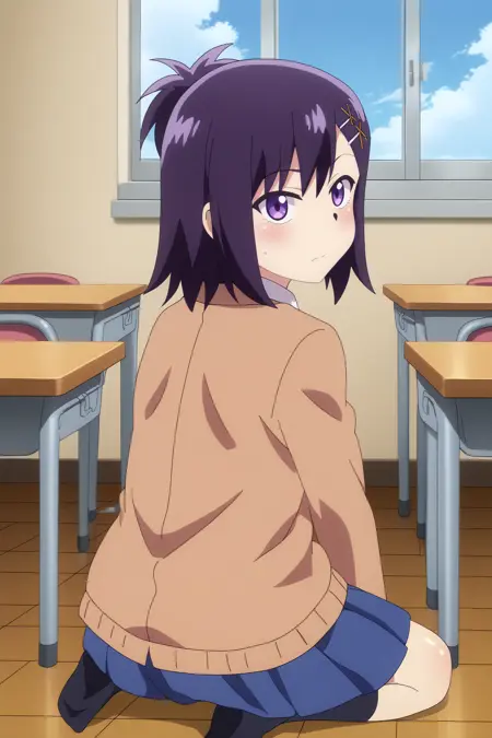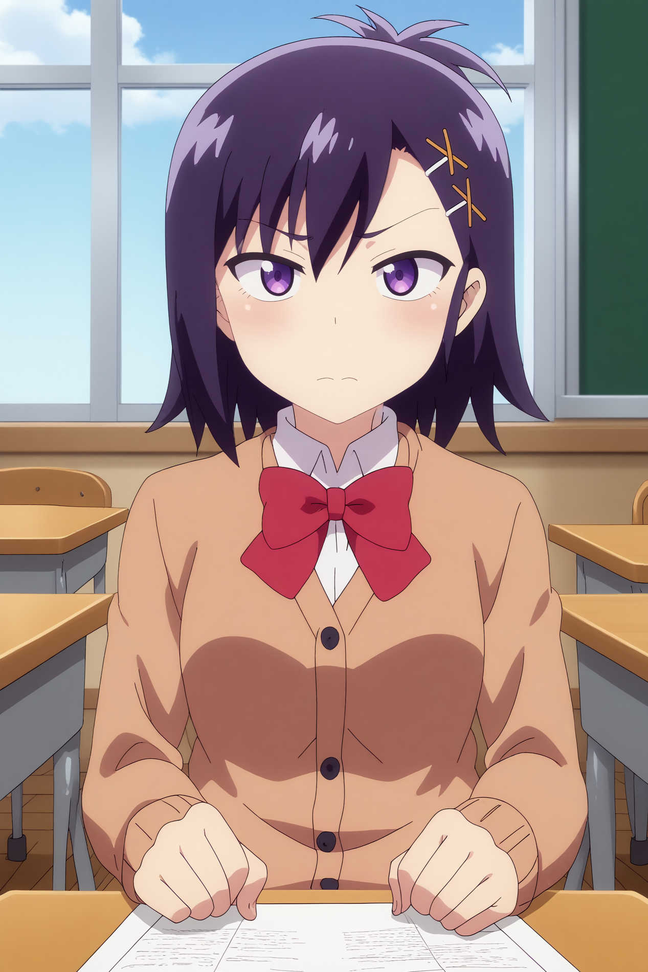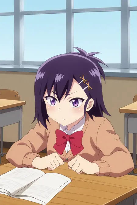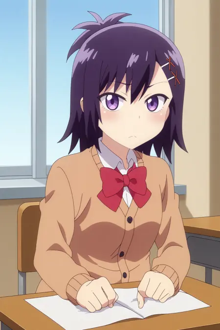 触发词:vignette april tsukinose,1girl,solo,long hair,looking at viewer,hair ornament,x hair ornament,bow,school uniform,short hair,hairclip,cardigan