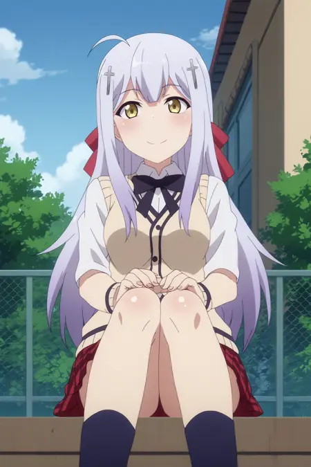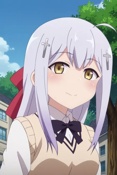 触发词:raphiel ainsworth shiraha,1girl,solo,long hair,looking at viewer,cross hair ornament,hair ornament,smile,school uniform,ahoge