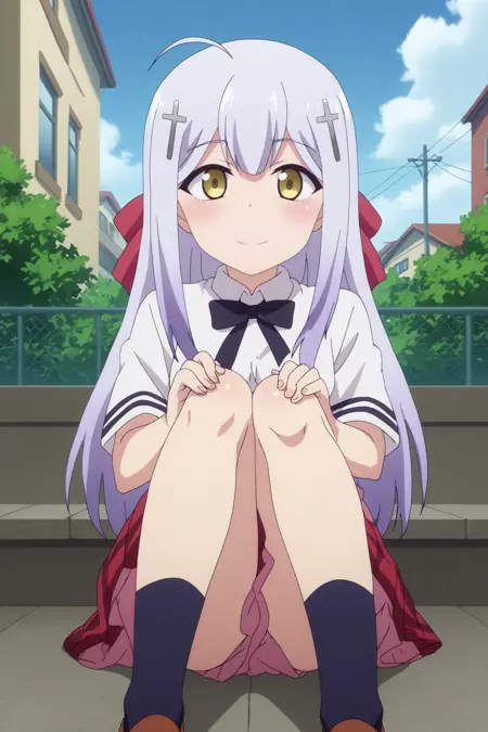 トリガー: raphiel ainsworth shiraha,1girl,solo,long hair,looking at viewer,cross hair ornament,hair ornament,smile,school uniform,ahoge