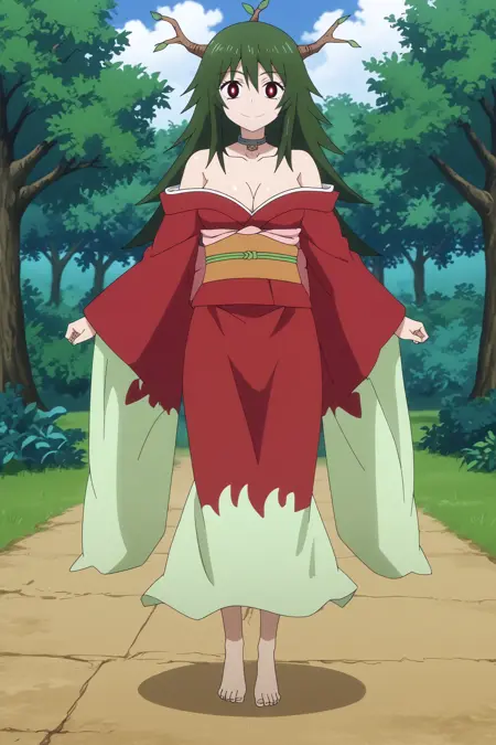 트리거: 산신, 1girl, 솔로, 긴 머리, 성숙함, 시선 반환, 일본식 복장, 뿔, 키모노, 가슴, 젖가슴 노출, 미소, 상반신, 어깨 노출