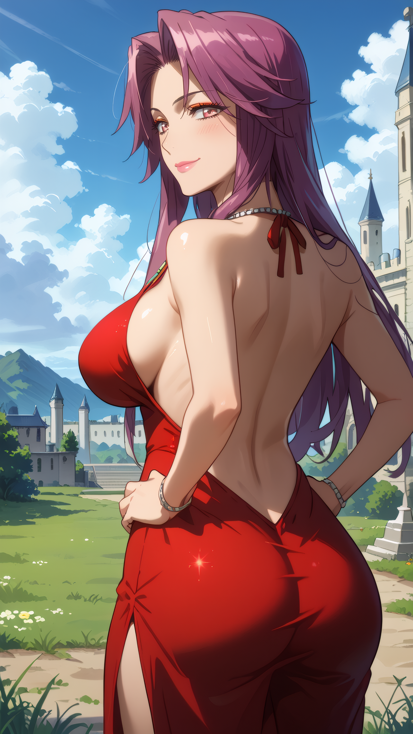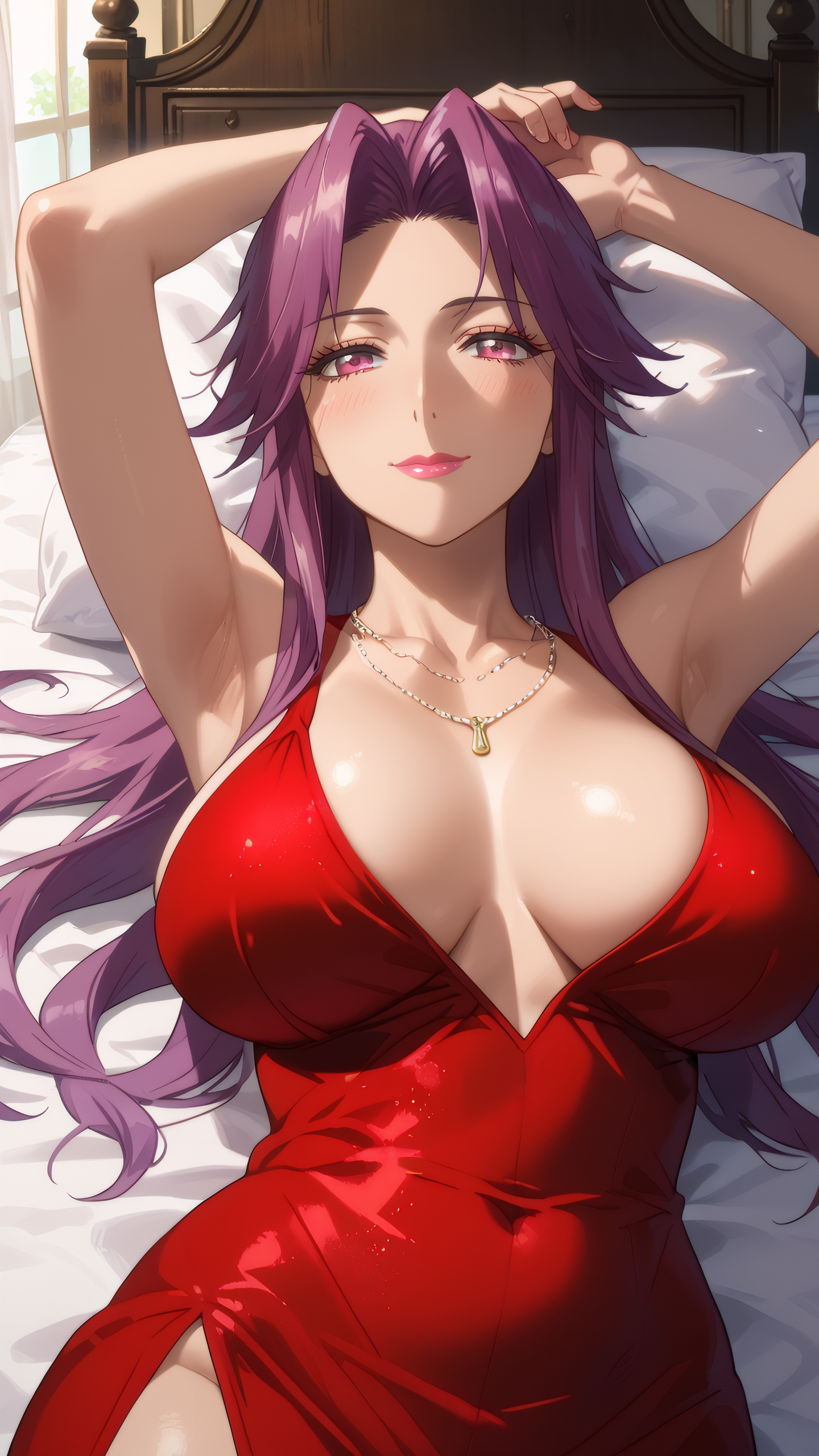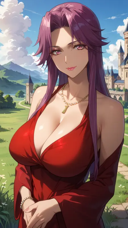 yuriko_takagi, pink eyes, purple hair, long hair, jewelry, necklace, lipstick, makeup, red dress,bare shoulders,