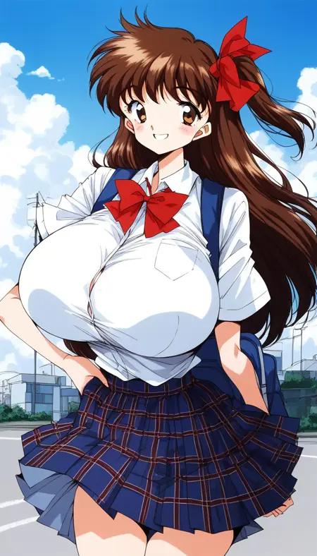 MIYU(saikou-no-kankei), 1girl, solo, huge breasts, brown hair, long hair, brown eyes, red plaid bow, hair bow,
