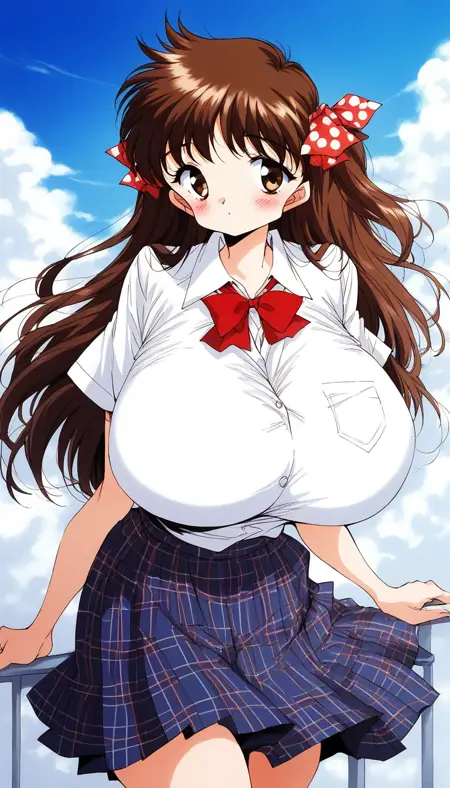 MIYU(saikou-no-kankei), 1girl, solo, huge breasts, brown hair, long hair, brown eyes, red plaid bow, hair bow,