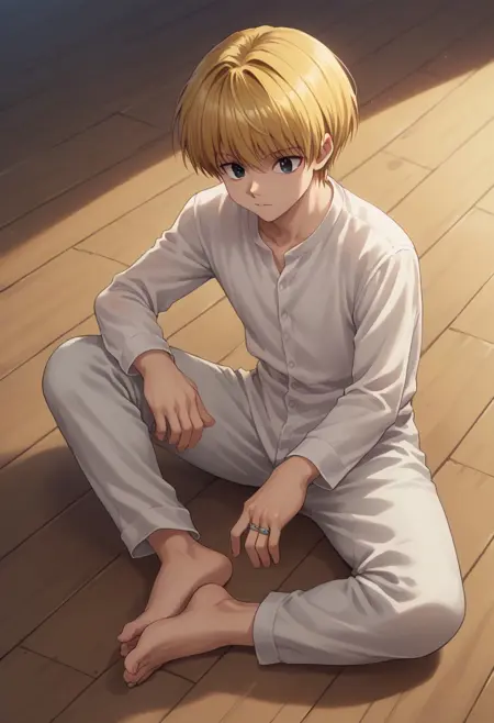 窟卢塔·西索,1个男孩,男性焦点,solo,金发,刘海,中发,发型替换,黑眼,上衣,白上衣,长袖,围裙,蓝黄围裙,裤子,白裤子,鞋子,蓝色鞋履,珠宝,戒指,单耳环