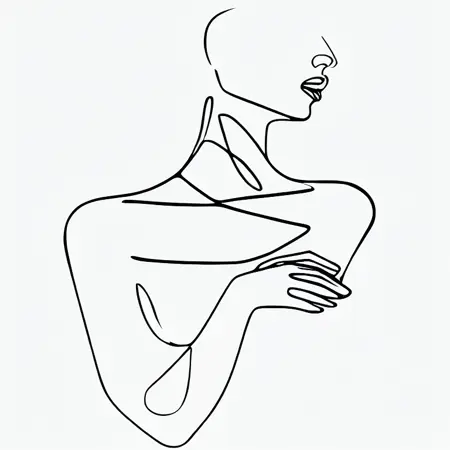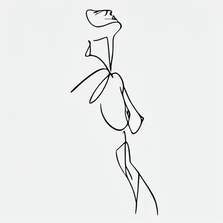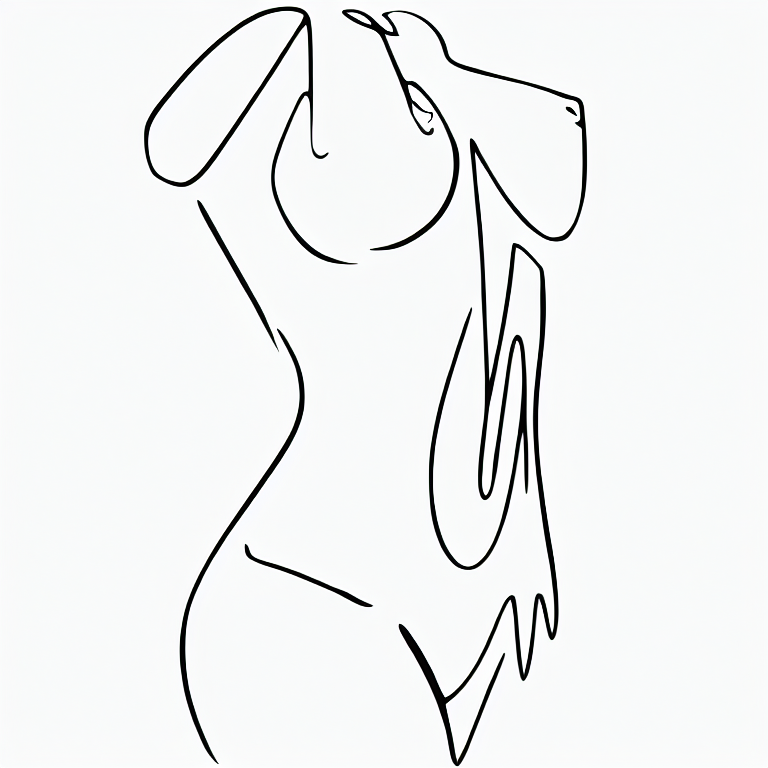 Minimalist with only a few lines defining, black and white line drawing of female figures with emphasizes on the contours of the figure's torso, movement, curves and forms over detailed features.