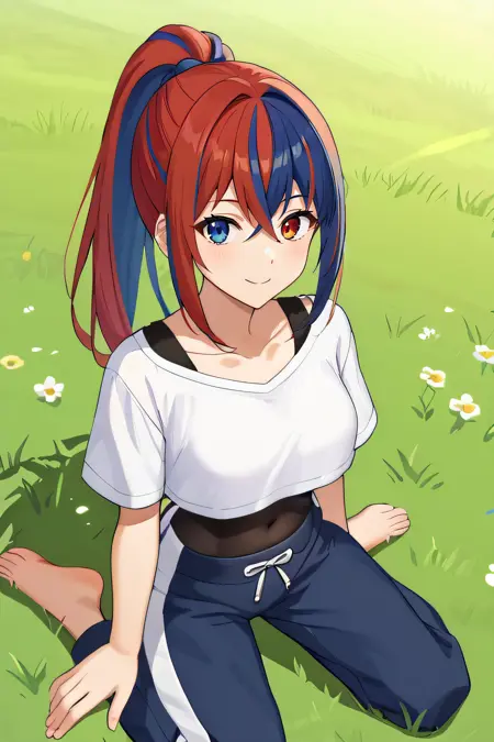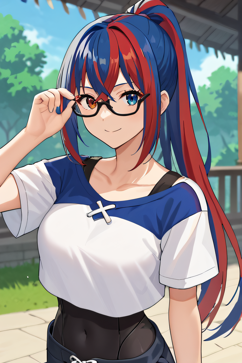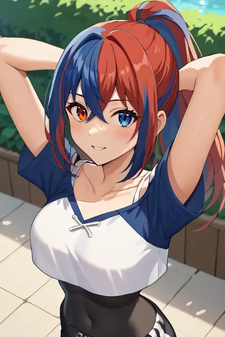 你可能会发现头发颜色偏向其中一种,我的情况是偏向蓝色。如果是这种情况,除了使用分色头发提示词外,你还可以添加缺失的颜色作为提示词。在我的案例中,头发有时会达到80%是蓝色,因此我添加了“red hair:0.5”提示词,如果不是这种情况,你可以删除它。