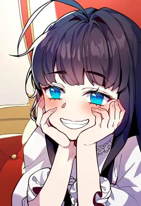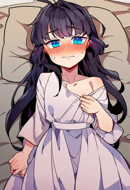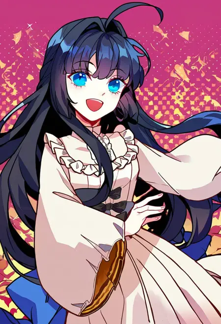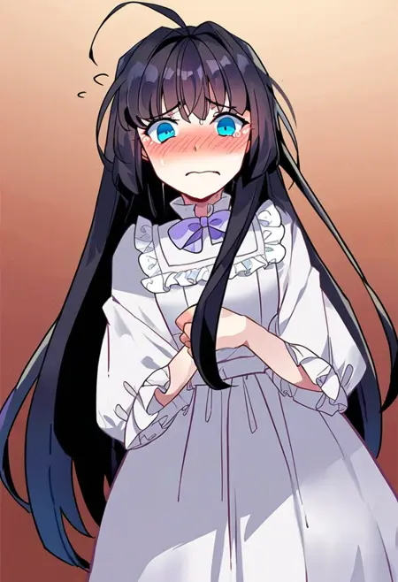blanche_freidkin1girl,flat chest,blue eyes,black hair,long hair,hair intakes,ahoge,white dress,