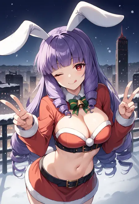 红色眼睛、长发、紫色头发、钻头发型、齐刘海、白色动物耳朵、白色兔耳、兔尾