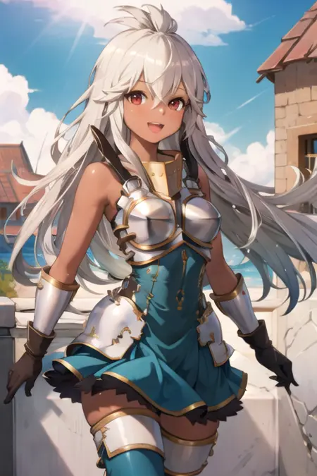 zooey_reg, armor, gloves, thighhighs, breastplate, blue skirt, bare shoulders