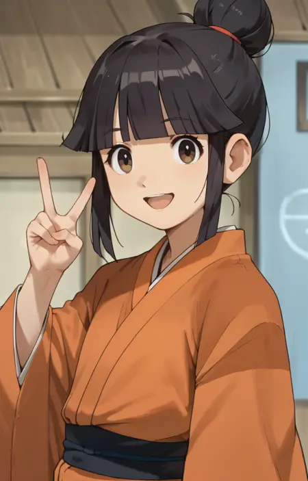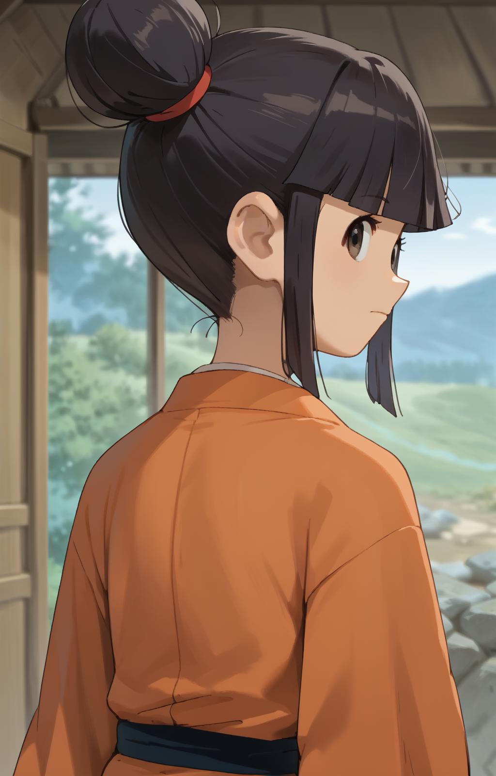 okatsu, black hair, single hair bun, hair up, bangs, brown eyes, japanese clothes, orange kimono