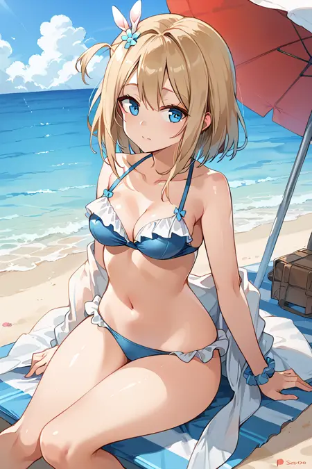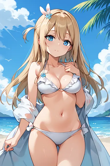 suomi (Girls' Frontline), 1girl, blue eyes, blonde hair, suomi-swimsuit, white bikini, white panties, long hair