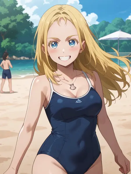 ushioswimsuit,collarbone,jewelry, shell necklace, swimsuit, blue one-piece swimsuit,