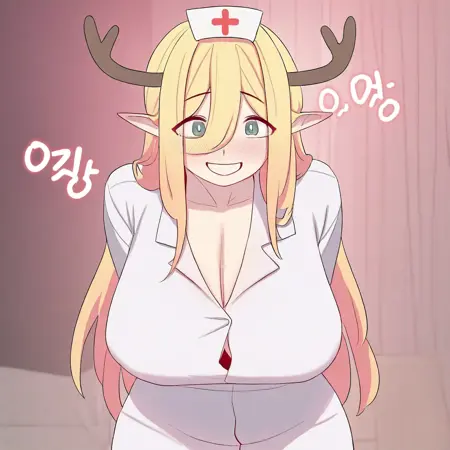 미요: 날카로운 청록색 눈, 뾰족한 귀, 아름다운 금발 머리카락, 긴 머리카락, 눈 사이의 머리카락, 커다랗고 헐렁한 가슴, 큰 사슴 뿔,