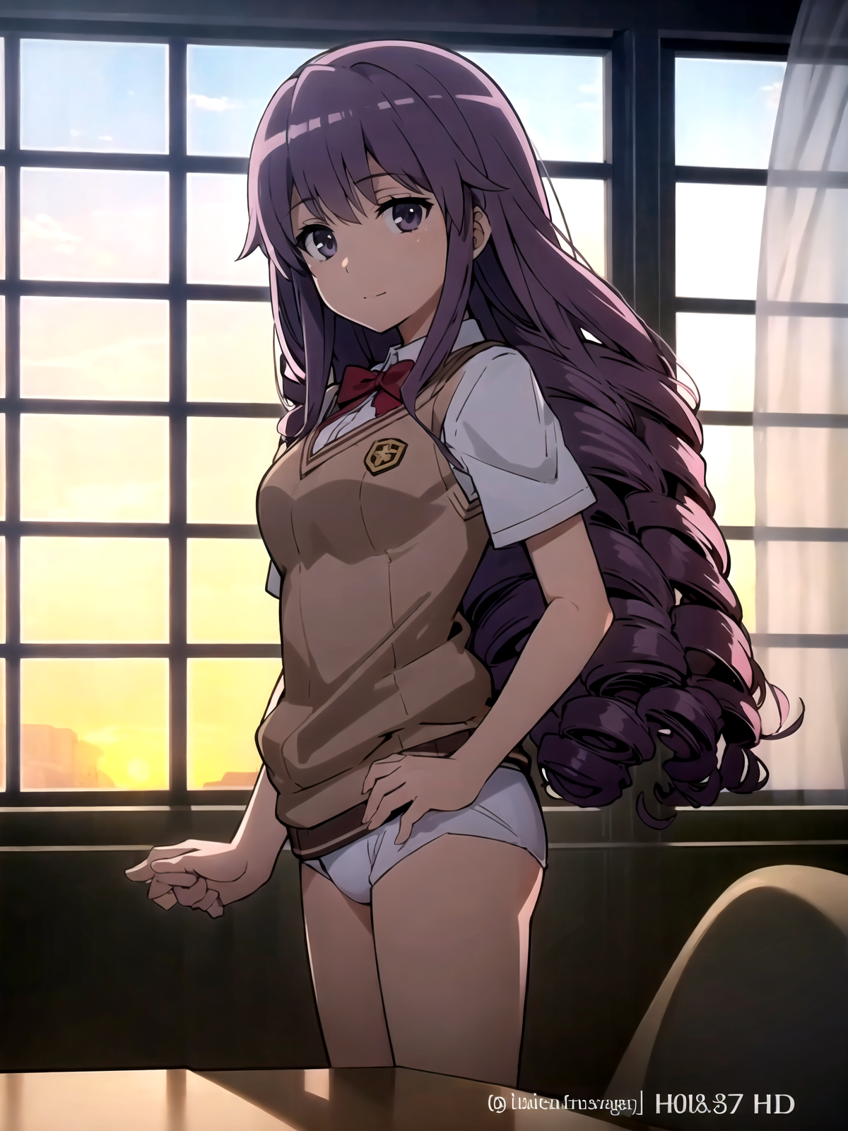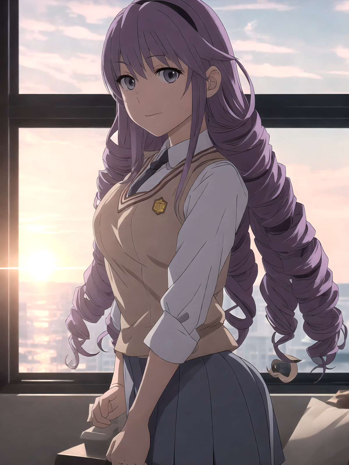 Promts: junko hokaze, purple eyes, purple hair, long hair, drill hair,